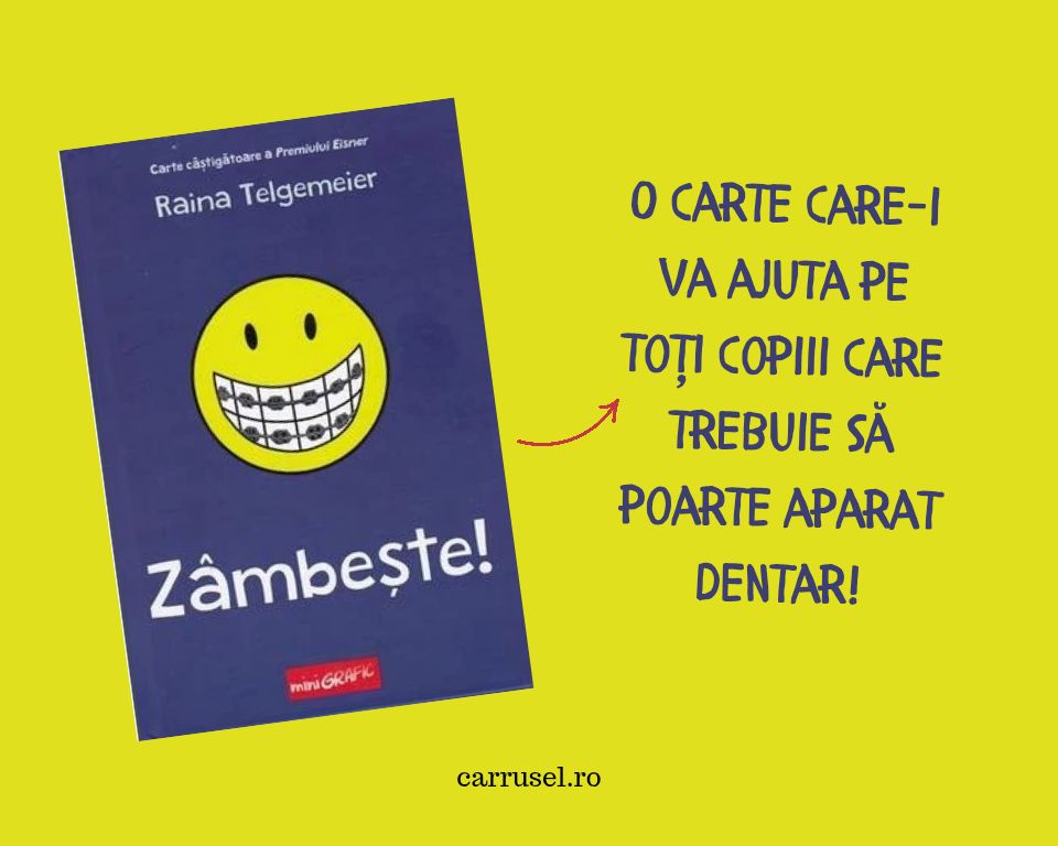 Raina Telgemeier este o scriitoare americană care, la vârsta de 12 ani, în urma unui mic accident, și-a pierdut doi dintre dinții din față. În consecință și în condițiile în care avea deja niște probleme, încă de dinainte de accident, a fost necesar să poarte mai multe tipuri de aparate dentare și să treacă prin diferite intervenții chirurgicale. Ce este însă foarte fain e faptul că Raina a ales să povestească această experiență într-o carte de benzi desenate pentru copii. Cartea asta e tradusă și în limba română, se numește Zâmbește și a apărut la Editura Arthur. Iar mie îmi pare rău doar că am aflat de asta abia acum.