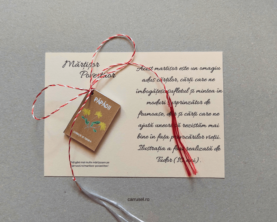 Și, ca să nu mai lungesc vorba, vă spun că mă refer la niște mărțișoare în formă de carte. În miniatură, desigur, căci sunt de pus în piept. Și sunt tare frumușele, deși sunt subiectivă atunci când scriu asta, căci sunt îmbogățite cu desene făcute de copiii mei. Și sunt realizate integral din hârtie pentru ca, deși nu se deschid, să semene cât mai mult cu o carte adevărată.