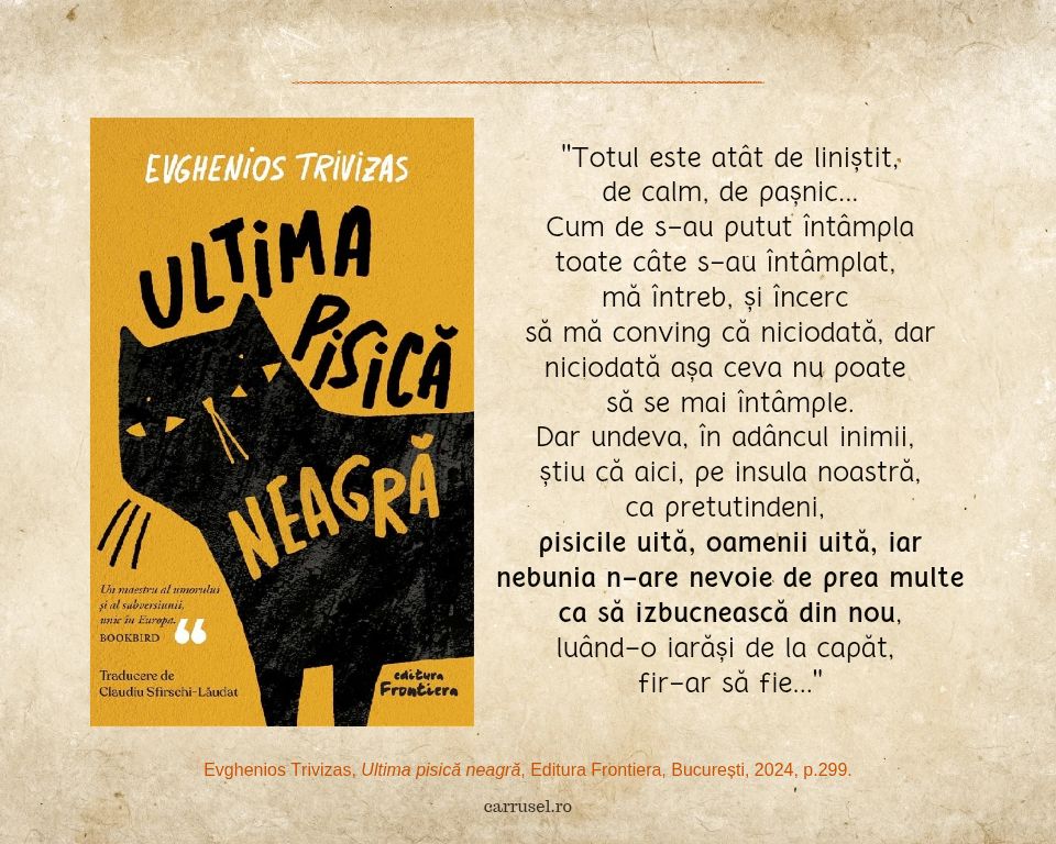 Ultima pisică neagră este o carte scrisă de Evghenios Trivizas și apărută la Editura Frontiera. Ca întotdeauna, deși, de-a lungul timpului, Editura Frontiera mi-a câștigat încrederea, am avut câteva emoții atunci când am început să le-o citesc celor mici (da, încă citim și împreună), cartea fiind recomandată pentru copiii de peste 10 ani, iar Maria având abia 8 ani. Nu-i prima dată când citim cărți pentru copii mai mari, în general aleg astfel de cărți pentru a fi citite împreună, tocmai pentru că eu sunt acolo, lângă ei, și pot explica diferite lucruri, la nevoie. Asta nu înseamnă că nu ne-am lovit de provocări de-a lungul timpului, inclusiv de data aceasta, deoarece Maria e și foarte empatică și, la fel ca frățiorul ei, iubește mult pisicile. Prin urmare, am avut vreo două momente dificile, atunci când am citit despre chinurile la care erau supuse pisicile din carte. Din fericire, autorul a știut foarte bine să creeze un echilibrul, iar momentele triste erau precedate sau urmate de momente amuzante, care ajutau la eliberarea tensiunii. În plus, la rândul meu, am vorbit cu Maria și Tudor și i-am întrebat dacă doresc să continuăm să citim. Amândoi au spus da fără ezitare și nu au regretat ulterior, mai ales că finalul a fost unul foarte ok. Totuși, am ținut să povestesc despre asta, deoarece nu recomand ca această carte să fie citită de copiii mai mici sau foarte sensibili fără prezența unui adult. Apoi, chiar și cei mai mari ar putea avea nevoie de ceva sprijin, căci sunt abordate câteva subiecte foarte interesante și, în același timp, grele, care ar putea să nască întrebări suplimentare și, în acelasi timp, să ofere oportunitatea unor discuții prețioase și interesante cu cei mici, discuții pe care sigur n-am vrea să le ratăm. Astfel, vom recunoaște în carte rasismul și discriminarea, manipularea, războiul, rezistența, moralitatea (sau lipsa ei), nedreptatea, trădarea și multe altele. Din fericire, balanța e echilibrată, deoarece ne sunt prezentate și puterea prieteniei, pacea și liniștea, reziliența și multe alte lucruri pozitive. Totul cu un limbaj potrivit pentru cei mici, desigur.