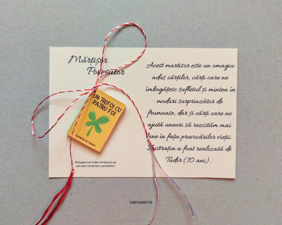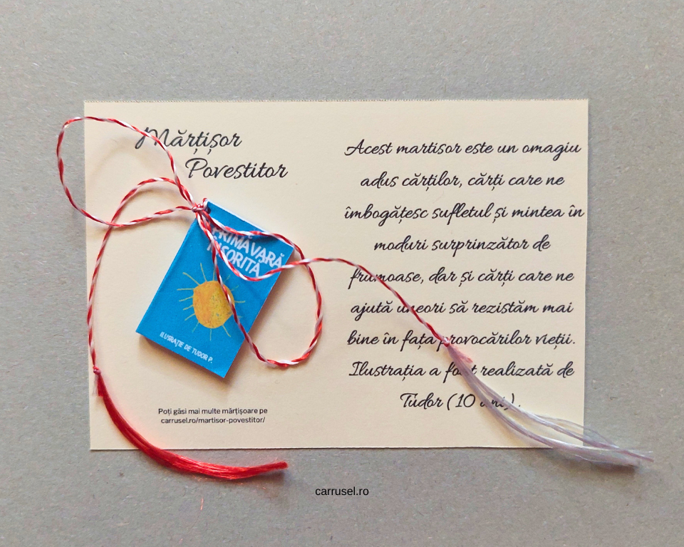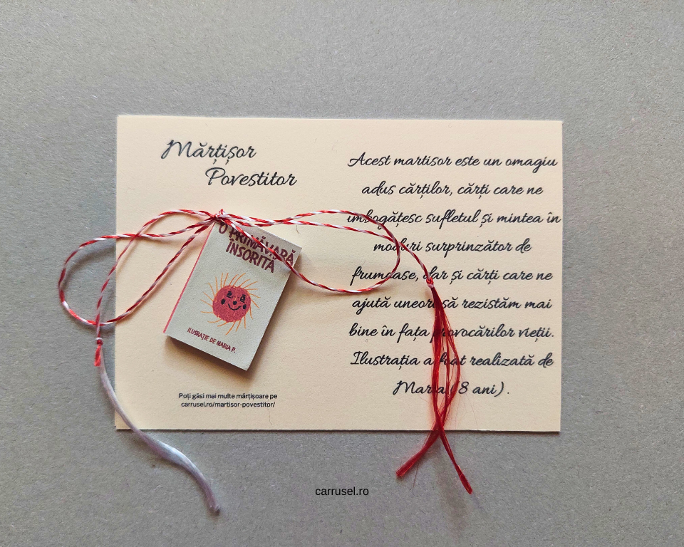 Mărțișorul Povestitor este o carte în miniatură. Poate fi o carte pentru copii, o carte pentru oameni mari sau o carte cu simboluri ale primăverii și frumosului. Este realizat integral din hârtie, uneori cuprinde citate din cărți adevărate și ilustrații făcute de copiii mei, Tudor și Maria.