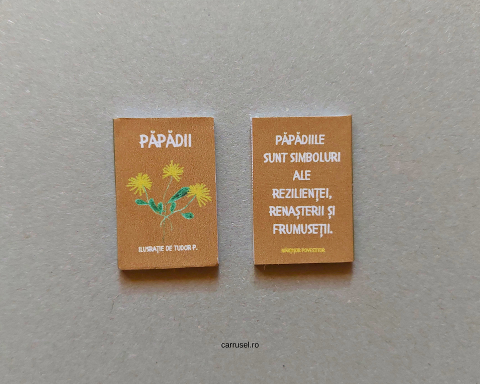 Păpădiile sunt unele dintre florile noastre preferate și-avem o mulțime de motive pentru care ne plac. Cel mai important dintre acestea e faptul că sunt unele dintre cele mai rezistente flori, reușind să răsară și să se dezvolte chiar și în unele dintre cele mai vitrege locuri. Pe mine, în mod special, m-a impresionat faptul că, îmi amintesc, la un moment dat am citit că păpădiile au puterea de a regenera cumva pământul în care-și fac apariția. Și m-am bucurat enorm atunci când Tudor a reușit să le deseneze și-am putut face unul dintre mărțișoarele mele preferate.