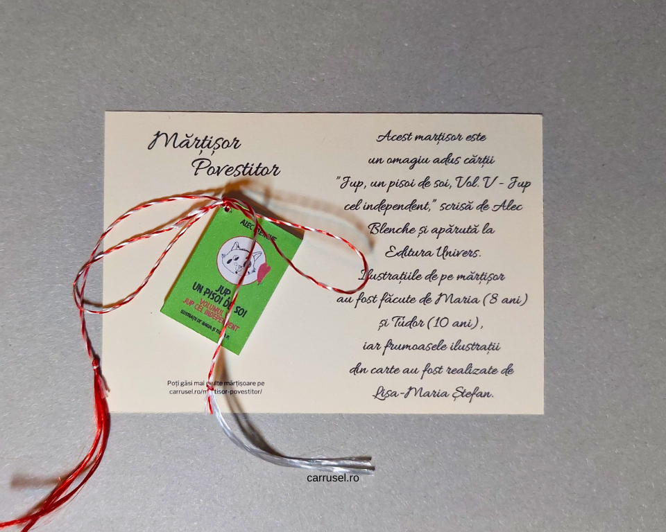 Cărțile lui Alec Blenche au ocupat și ocupă un loc aparte în sufletele noastre, în special cele cu Erus, pe care le-am cunoscut mai întâi cu Tudor, în serile noastre speciale, când citeam singuri. Totuși, pentru Mărțișorul Povestitor l-am ales pe Jup, pentru că cei mici adoră pisicile, dar și penru că le-a plăcut mai tare să-l desneze.